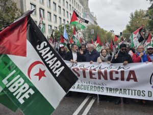 Madrid (ECS).- 50 años después de la entrega del Sáhara Occidental por la dictadura y la monarquía española, el grito de «Sáhara Libre» vuelve a llenar las calles de Madrid. El pueblo español vuelve a manifestarse junto al pueblo saharaui y al Frente Polisario, defendiendo su derecho a la autodeterminación y el fin de la ocupación marroquí del Sáhara.